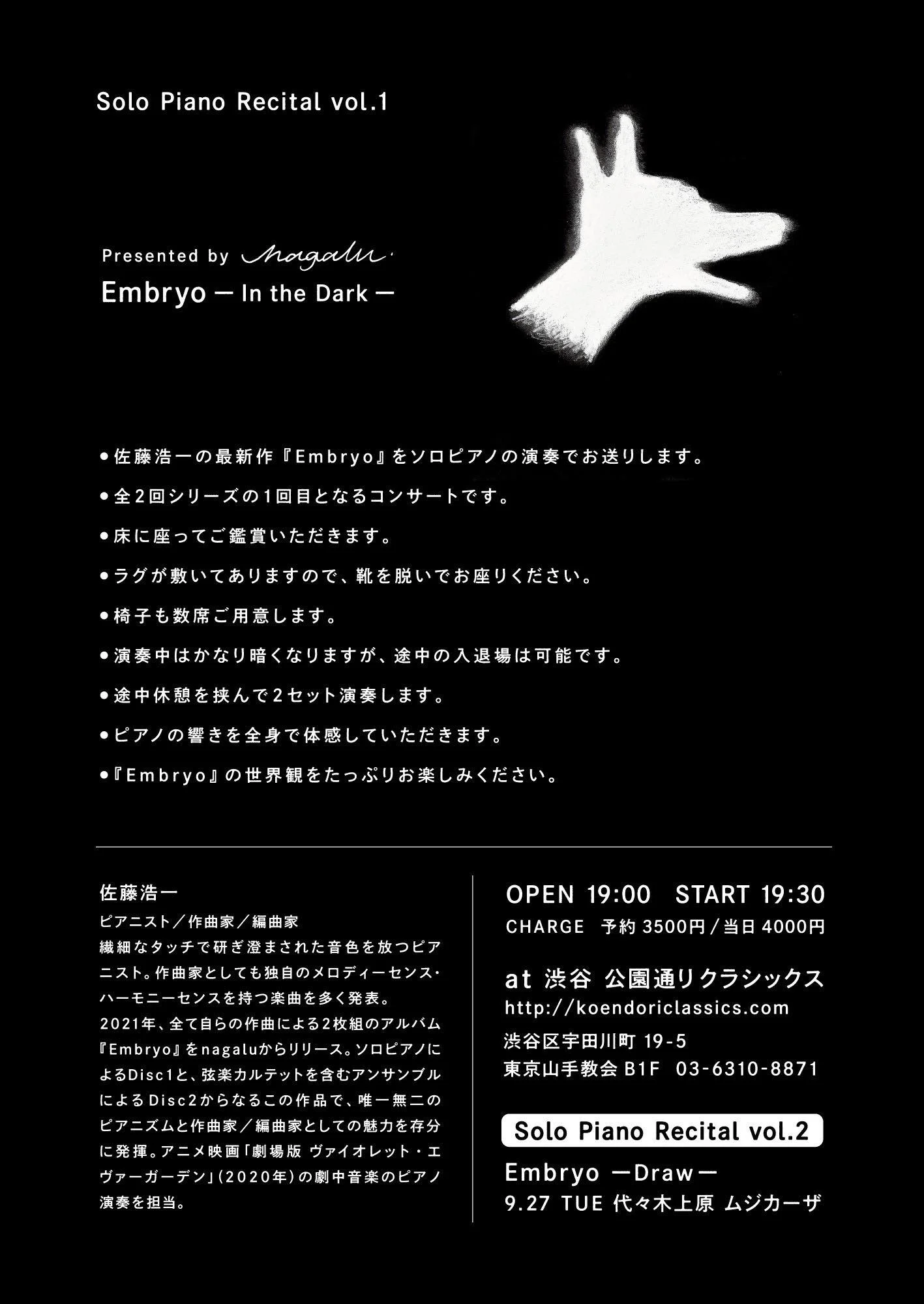 佐藤浩一 Solo Piano Recital vol.1 Embryo ~In the Dark~ Monday, May 30, 2022 7:30 PM 9:30 PM 19:30 21:30 Google Calendar ICS 渋谷公園通りクラシックス佐藤浩一(piano)